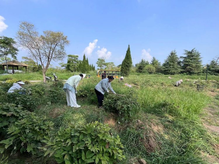 活動中,黨員同志們和運營人員、機關(guān)辦公室人員齊上陣,手持鐮刀、鋤頭等除草工具,主動認領(lǐng)除草修剪區(qū)域,鏟除牡丹花周邊的雜草、枯樹枝等雜物,積極投入到對牡丹園的養(yǎng)護工作中去,爭當“綠水青山”的護衛(wèi)者,盡管烈日當頭,酷暑難耐,卻絲毫未消減大家志愿服務(wù)的熱情和保護環(huán)境的堅定決心。?