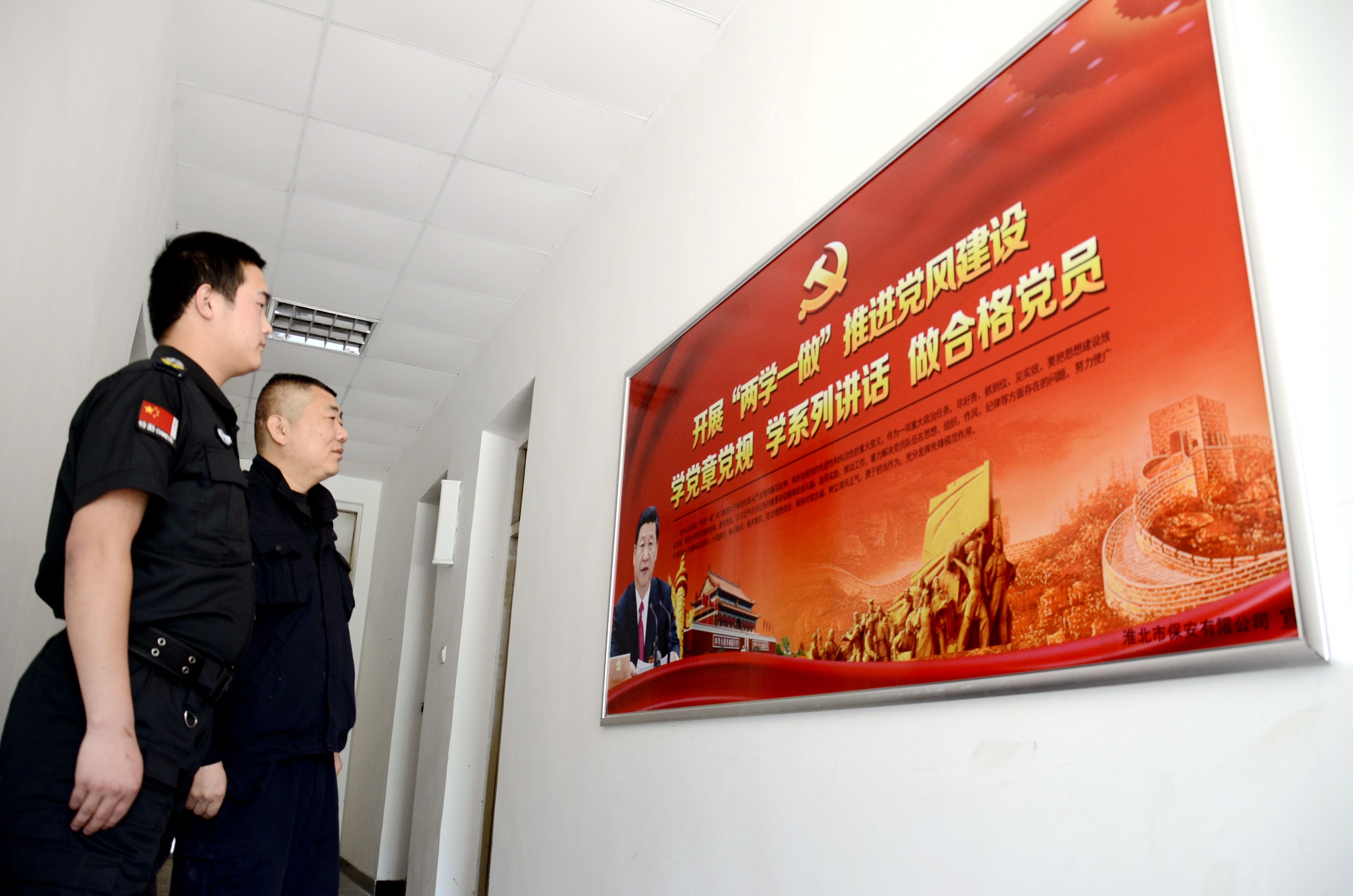 圖為同創(chuàng)集團(tuán)、交投公司、保安公司的 員工在觀看 兩學(xué)一做學(xué)習(xí)教育展板。